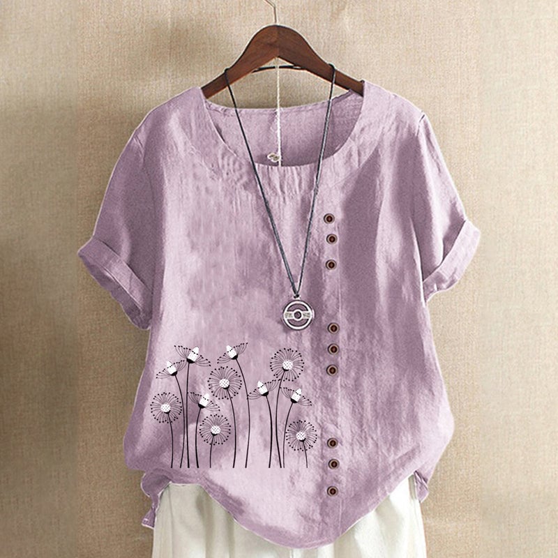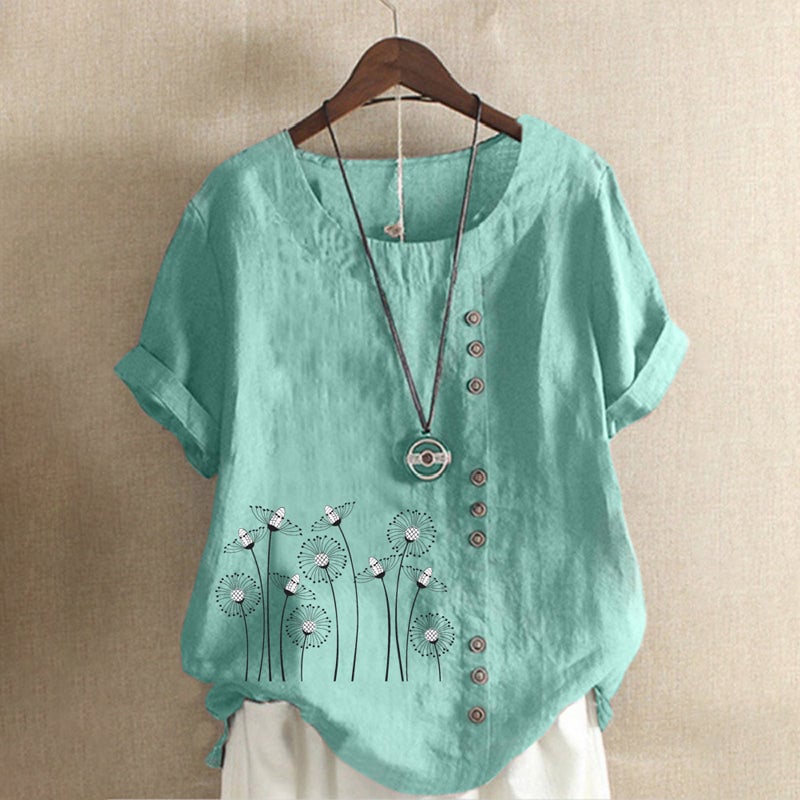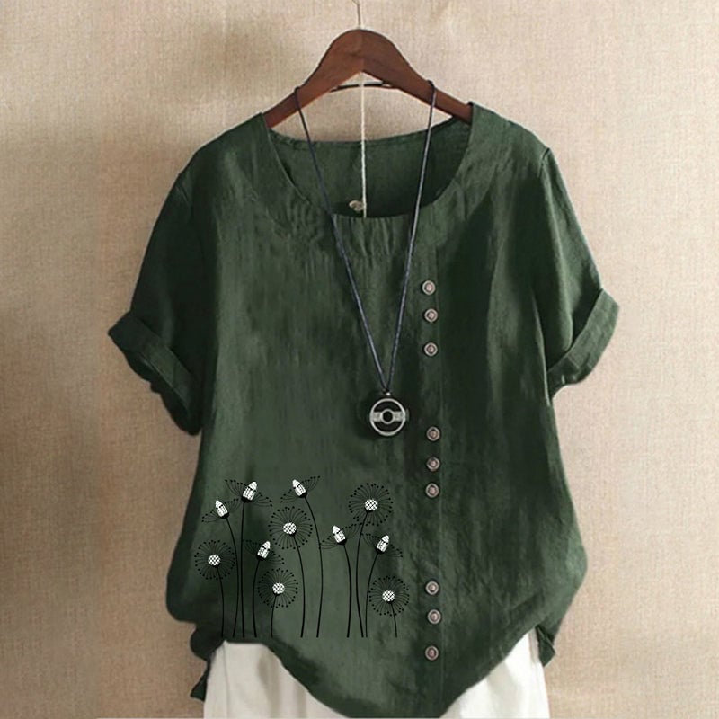 【Design】: Floral printed, crew neckline, rolled-up sleeve, nine metal decorative buttons at chest, side split, short sleeve basic tunic tee shirts