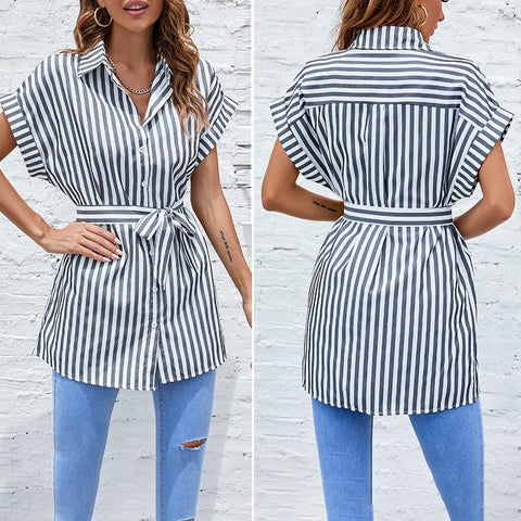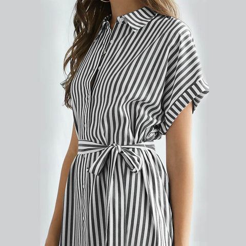 Unique Design: sheath dress with two side pockets, crew neck, about knee length, slim fit self tie belted waist, classic stripes, soft and stretchy cotton blend dress.